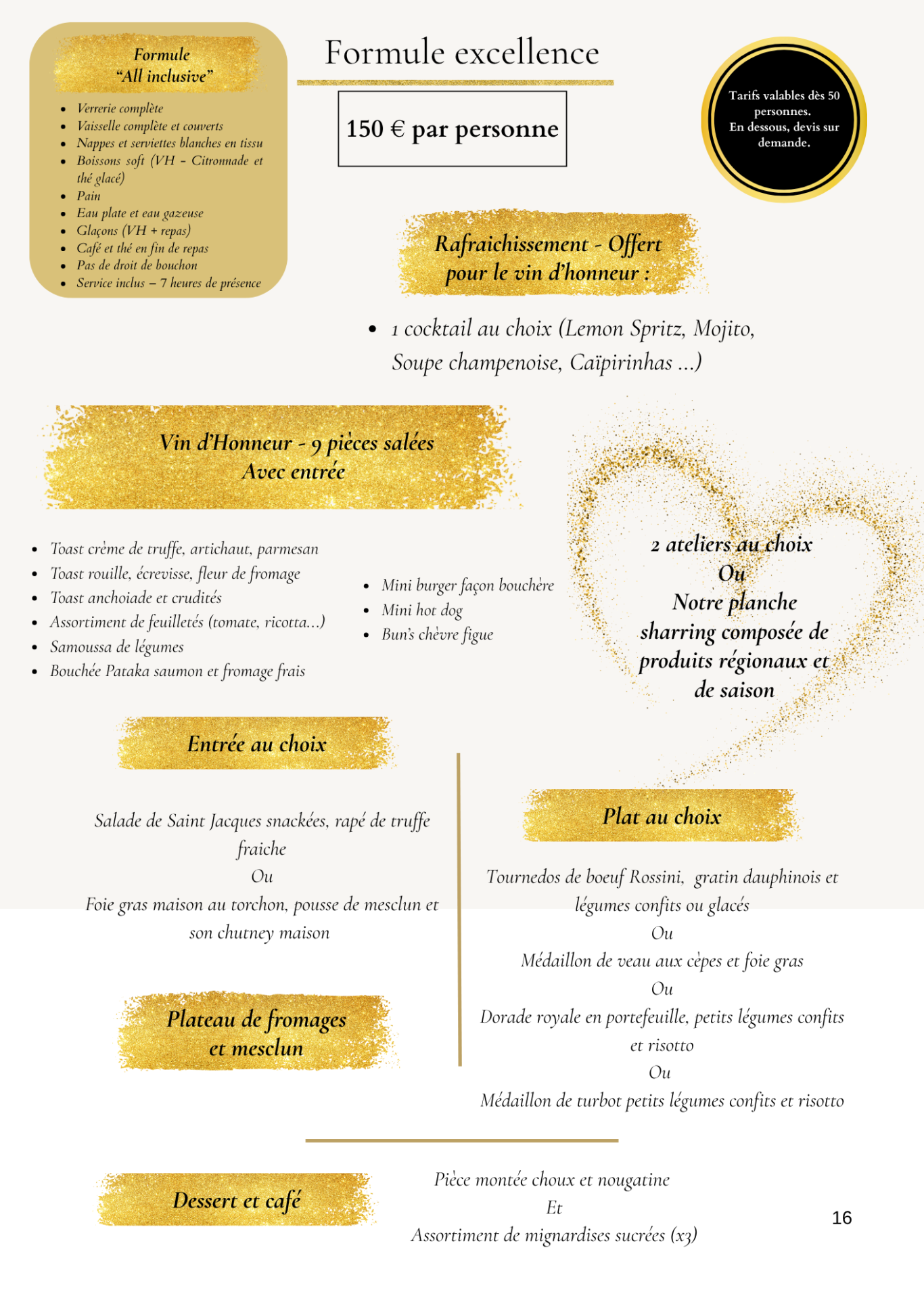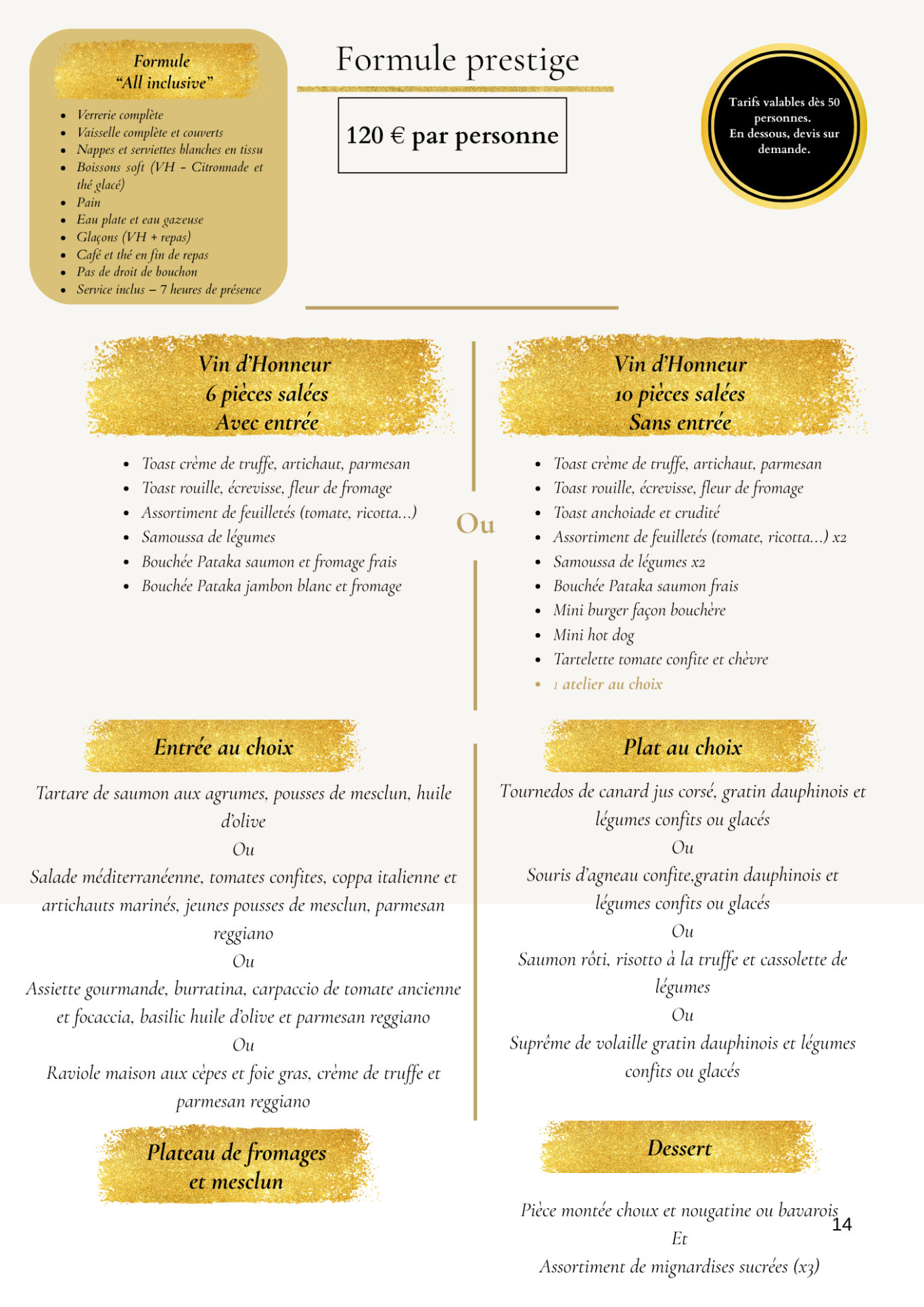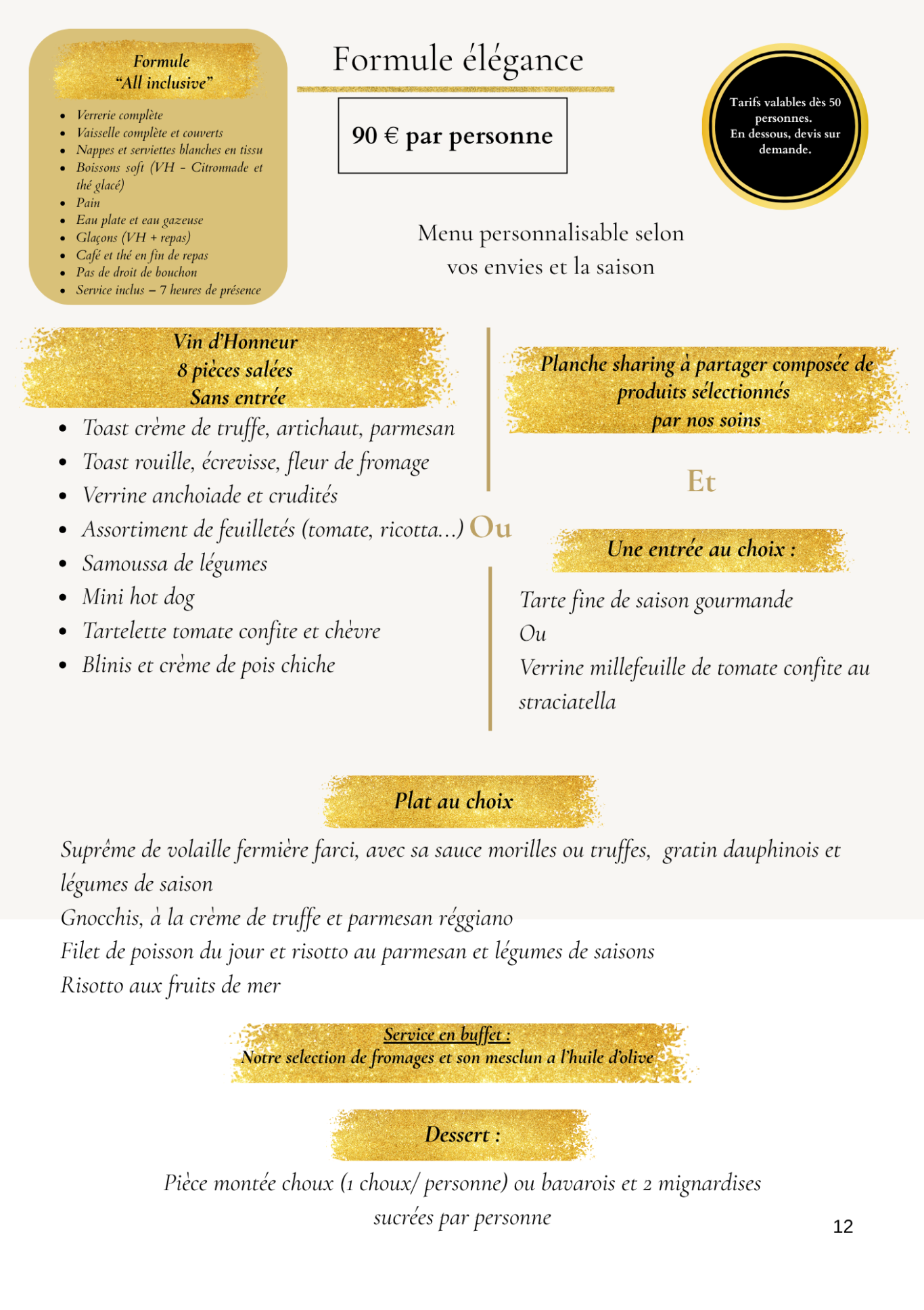 Service à table avec menu complet du Vin d’honneur au dessert.