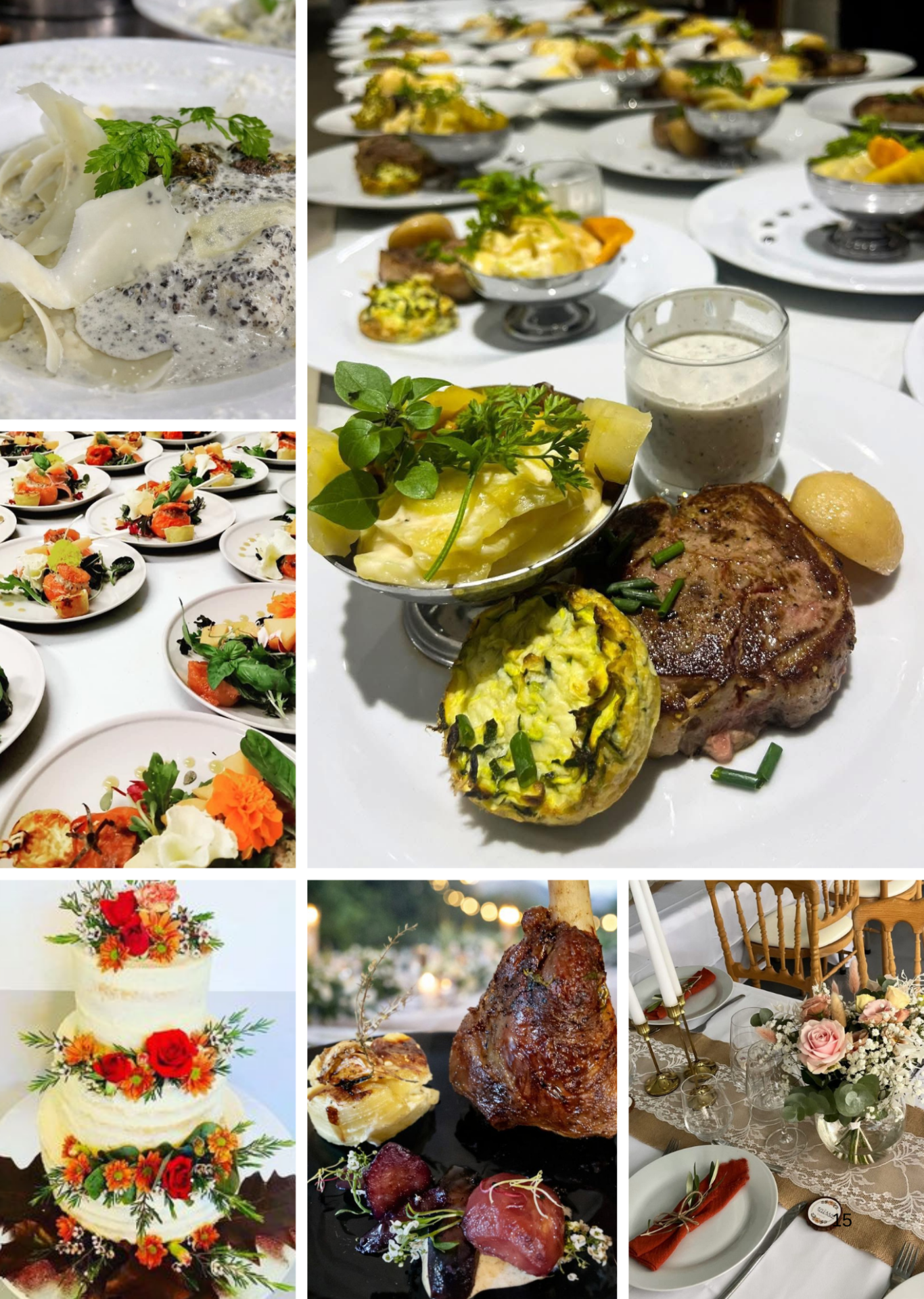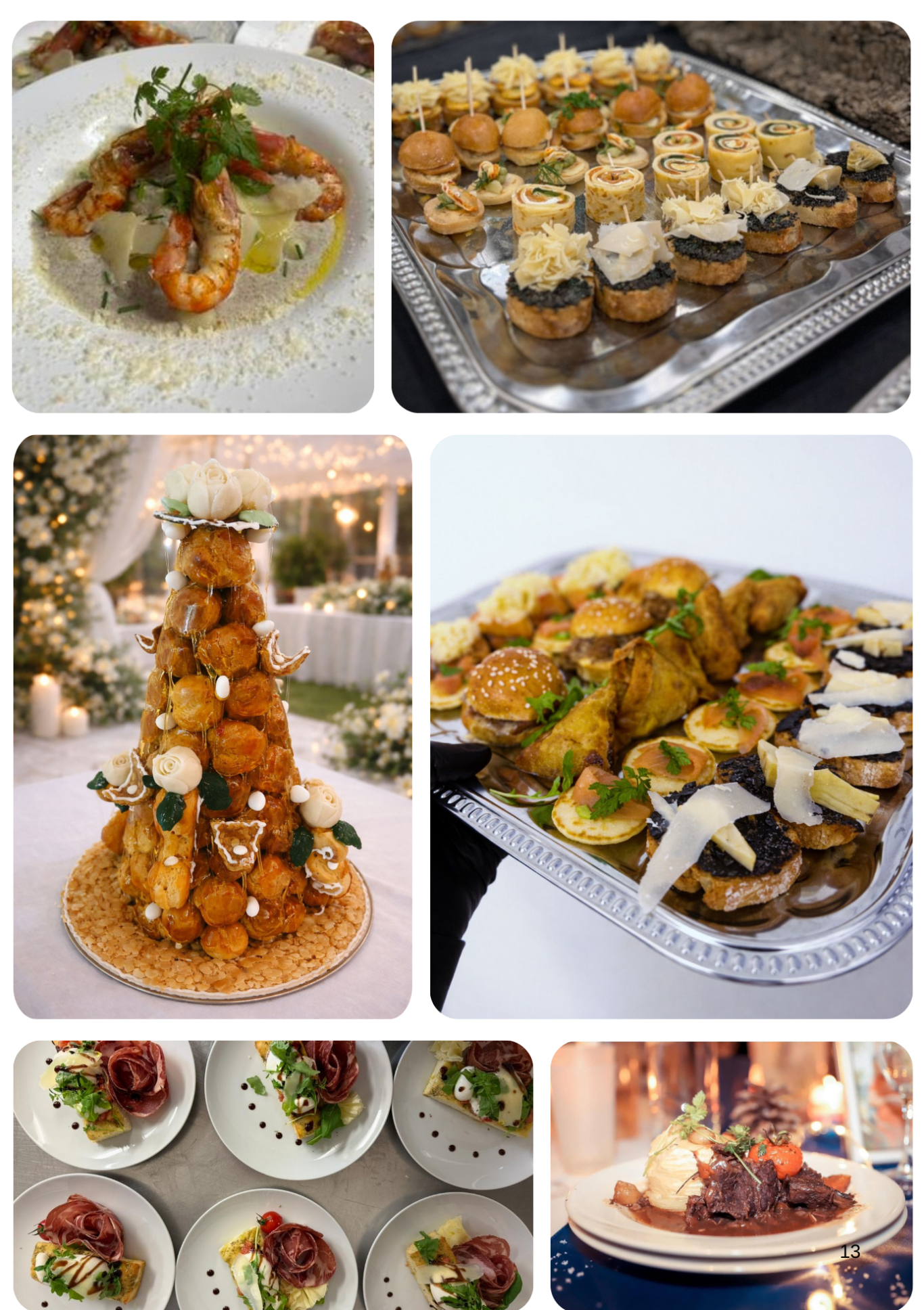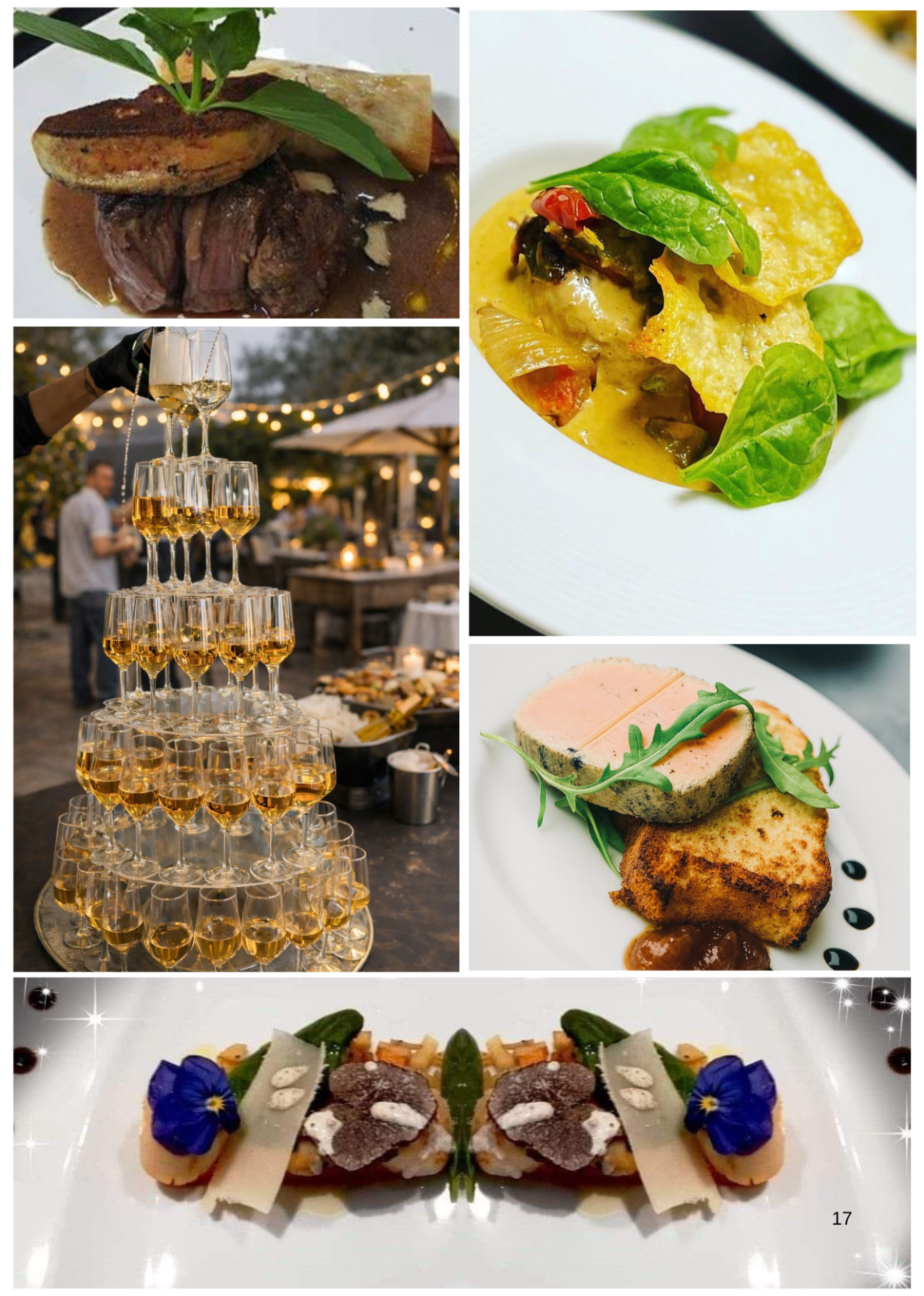 Service à table avec menu complet du Vin d’honneur au dessert.